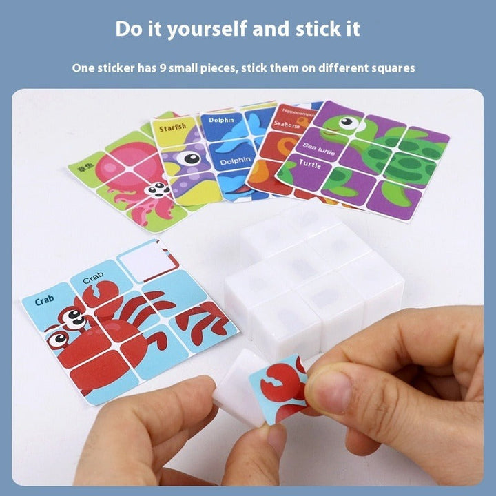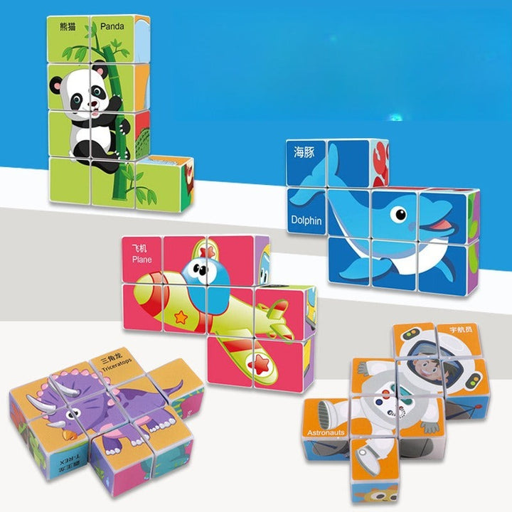 Each 3×3 cube grid forms six different pictures—think jungle friends, ocean life, dinosaurs, space, fruits & veggies, and transportation—so little learners can create endless stories as they play.
