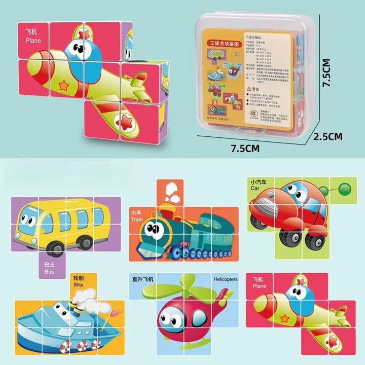 Give your child a hands-on learning experience with this Montessori-inspired wooden puzzle set! Each cube shows bright illustrations that combine into six adorable scenes—perfect for early cognition, storytelling, and problem-solving.