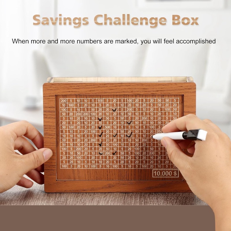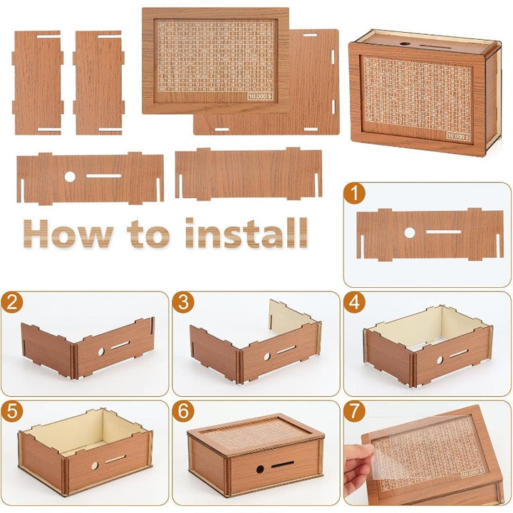 Wooden Savings Challenge Box – Track, Save & Reach $10,000